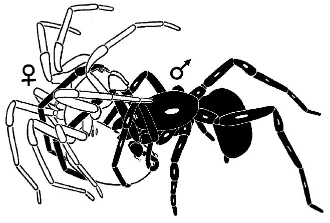 Kopulační poloha pavouka šestiočky sadistické. Samec (vpravo) probodává kopulačním orgánem bříško samice (obr. 2).